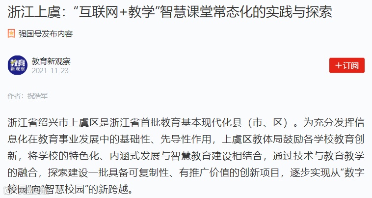 浙江省绍兴市上虞区是浙江省首批教育基本现代化县(市、区)。为充分发挥信息化在教育事业发展中的基础性、先导性作用,上虞区教体局鼓励各学校教育创新,将学校的特色化、内涵式发展与智慧教育建设相结合,通过技术与教育教学的融合,探索建设一批具备可复制性、有推广价值的创新项目,逐步实现从“数字校园”向“智慧校园”的新跨越。
