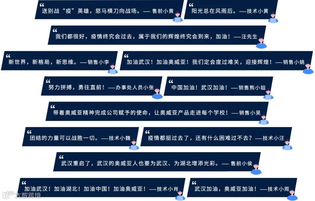 为了给湖北、武汉和所有奥威亚人加油,湖北办事处的同事们纷纷喊出了自己的口号(如下图)。那么,你更喜欢哪一个呢?