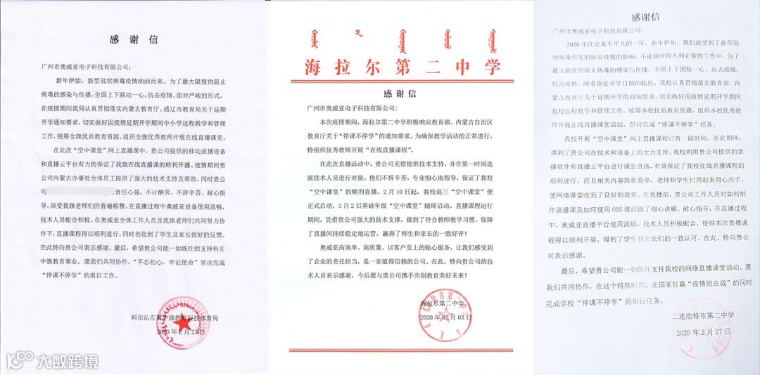 奥威亚“云+端”技术凭借高并发高稳定技术,以及符合教师教学习惯的优势,还成功助力内蒙古乌兰浩特市、呼和浩特市、内蒙古锡林郭勒盟、内蒙古呼伦贝尔等多地教育系统高效、高质、有序开展工作。此外,奥威亚还为客户提供高效率、高质量、以客户至上的贴心服务,在接收需求后的第一时间,选派专业技术人员到当地对接,对老师和电教人员进行悉心指导,保障直播顺利稳定进行。为此,奥威亚赢得了广大师生、家长及教育局的一致好评。