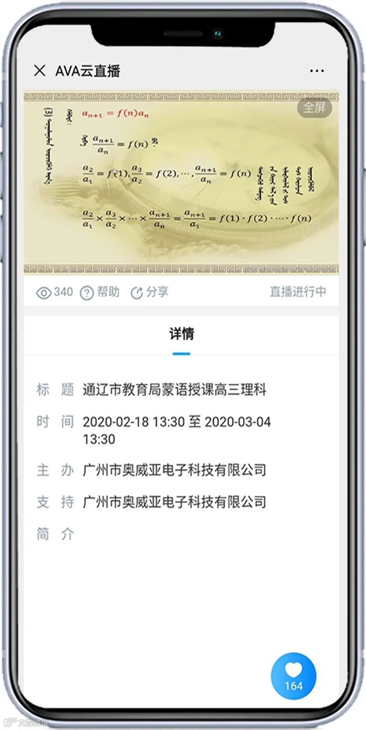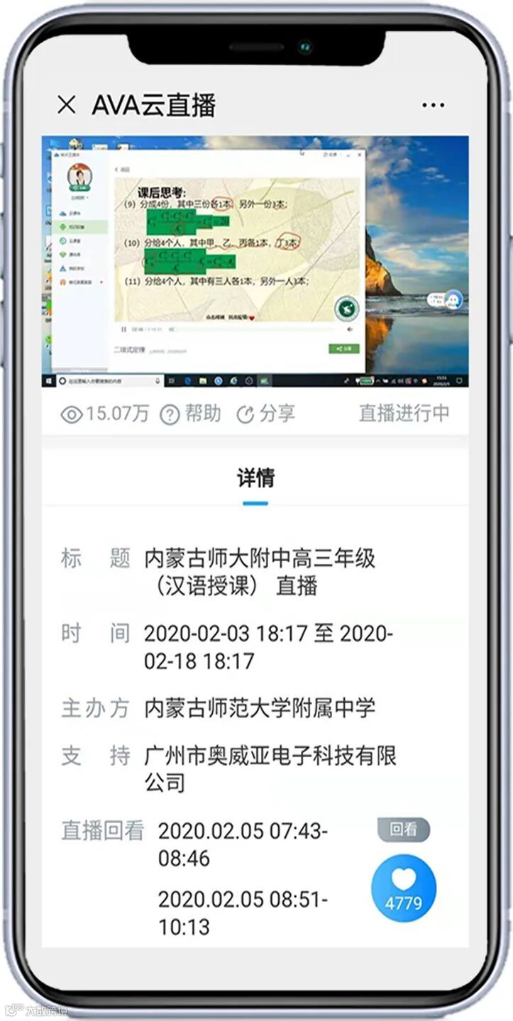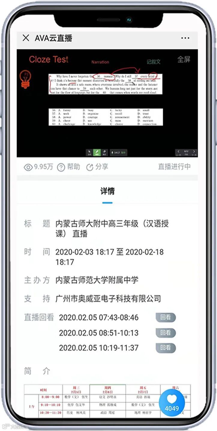 2月6日,阿拉善盟第一中学在奥威亚录播教室和移动录播设备支撑下,顺利组织高三学子开展“空中课堂”,这也是内蒙古自治区第一个实施疫情期间“停课不停教、不停学”的学校。通过奥威亚云直播技术,学生只需在家通过手机、平板、电脑等便携方式即可进行听课,真正实现在“师生不聚集”前提下,开展教学活动。