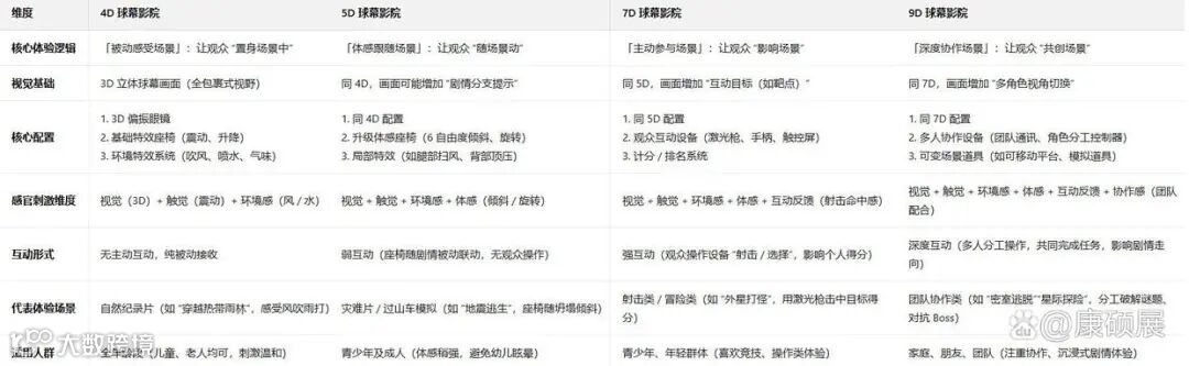 所有 “D” 都基于 “球幕(全包裹视野)” 实现视觉沉浸,区别在于 “球幕之外的附加体验”——4D 加 “环境特效”,5D 加 “体感座椅”,7D/9D 加 “互动设备”。