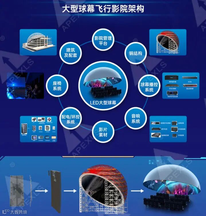 从技术现状来看,球幕系统形成了“投影球幕”与“LED球幕”两大主流技术路线,二者各有优势、互补应用。其中,投影球幕以金属涂层透声幕为核心,采用多机融合技术消除拼接缝,成本相对可控,适合中大型固定场馆,但对环境光敏感,亮度与色彩表现有限;LED球幕则采用小间距柔性LED模组拼接,曲率精准,支持8K甚至16K超高清显示,高色域、高亮度的优势使其可在明亮环境下使用,模块化设计可实现30天快速搭建,适配景区山地、滨水等复杂场地,目前已成为大型项目的主流选择。
