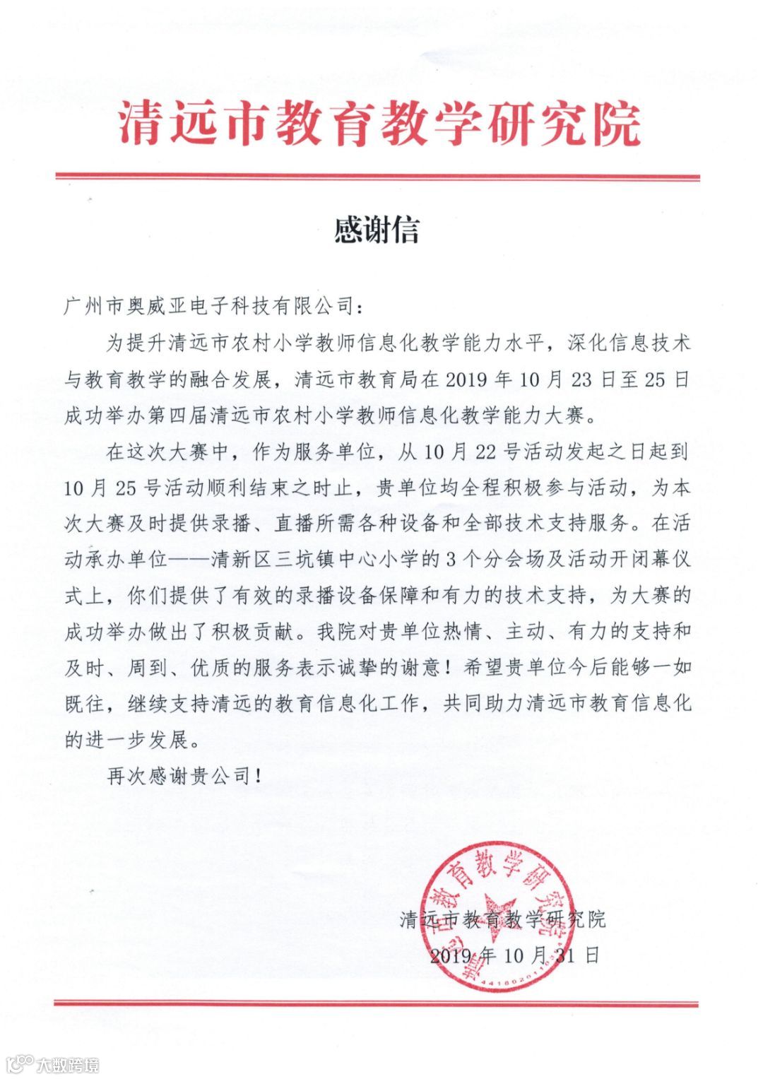 市教育教学研究院的感谢信,能得到客户的支持和认可,是奥威亚前进发展最大的动力。