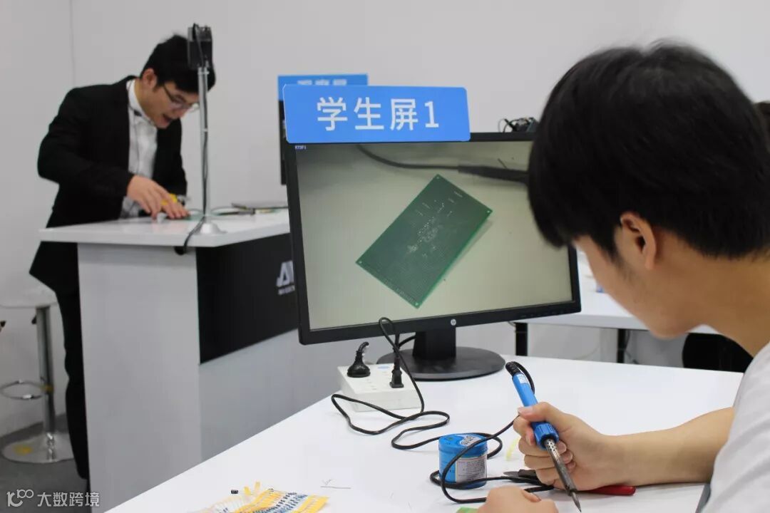 在智慧实训空间里,老师正在进行电路焊接演示,讲台桌上的摄像机将老师示范画面实时传输到学生的显示屏上。学生无需围在老师身边,也能清晰看到示范的操作细节。演示结束后,坐在工位上的2名学生进入实操环节,专注地进行电路焊接。每个工位的摄像机将学生焊接的特写画面,显示在老师的屏幕上。