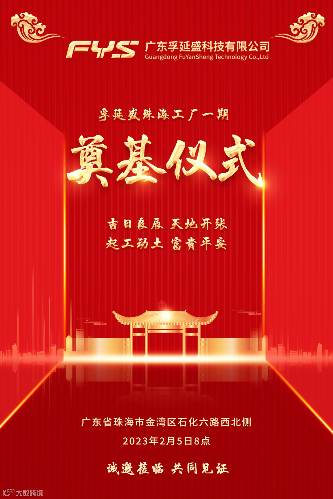 导读:兹定于2023年2月5日8点在广东省珠海市金湾区举行孚延盛珠海工厂一期的奠基仪式,诚挚邀请您拨冗出席,共同见证!