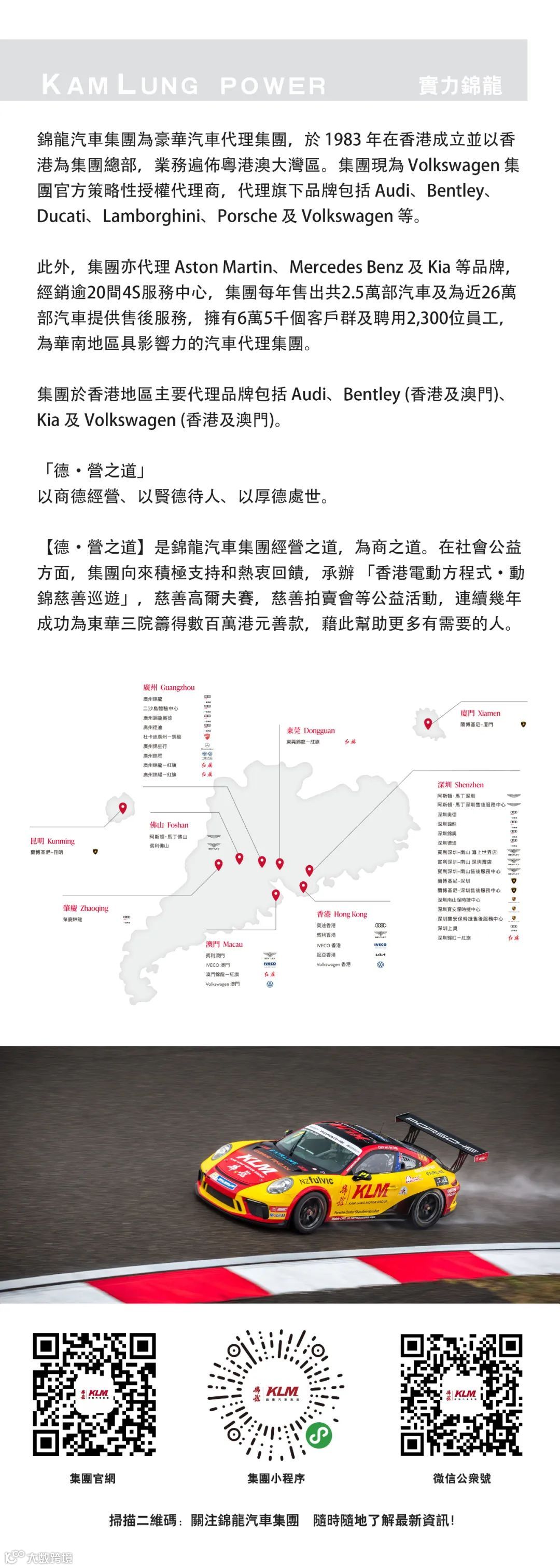 作为官方指定的宾利汽车经销商,宾利香港-锦龙拥有全亚洲首间配备 Mulliner 订制展示区的展厅及经厂方认证之售后服务中心。为客人提供全方位的汽车产品展示、个性化订制宾利专属空间,以及专业可靠的售后服务。锦龙汽车集团旗下的宾利原厂授权经销网络除了宾利香港-锦龙之外,还有宾利澳门、宾利深圳-南山及宾利佛山。
