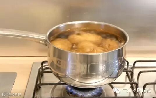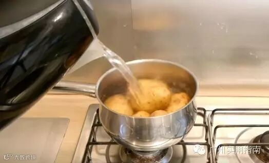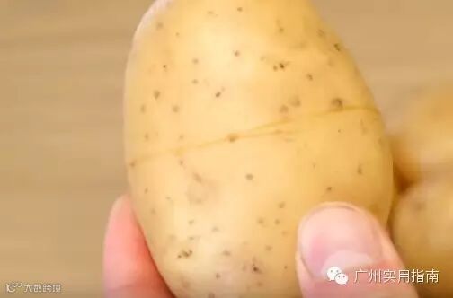 现在只要先在马铃薯上先划两刀,就像底下第二张图的样子;接着将水倒入,然后将水跟马铃薯一起煮开、煮熟。拿起一颗煮好的马铃薯,轻轻松松就去好皮了,而且还是完整的唷!