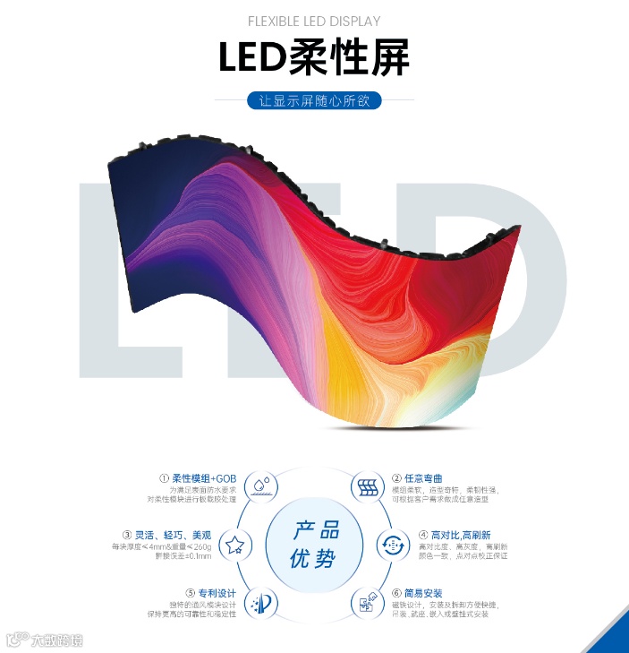 康硕展LED柔性屏,由LED软模组拼接而成。相较于传统屏幕,柔性屏幕优势明显,不仅在体积上更加轻薄,功耗上也低于原有器件,同时基于其可弯曲、柔韧性佳的特性,可任意制作成各种创意LED异形屏。