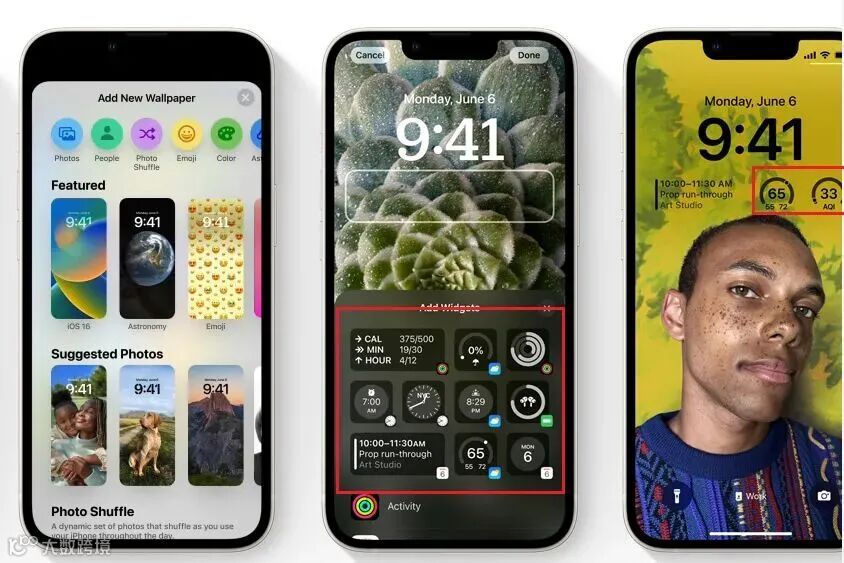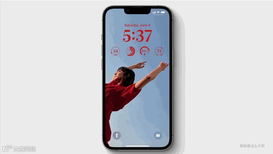 现在用户可实现个性化定制,例如可以在锁屏上添加各种小组件,比如天气组件、日程安排、电池点亮、健身记录圆环,以及各种APP的各种信息。