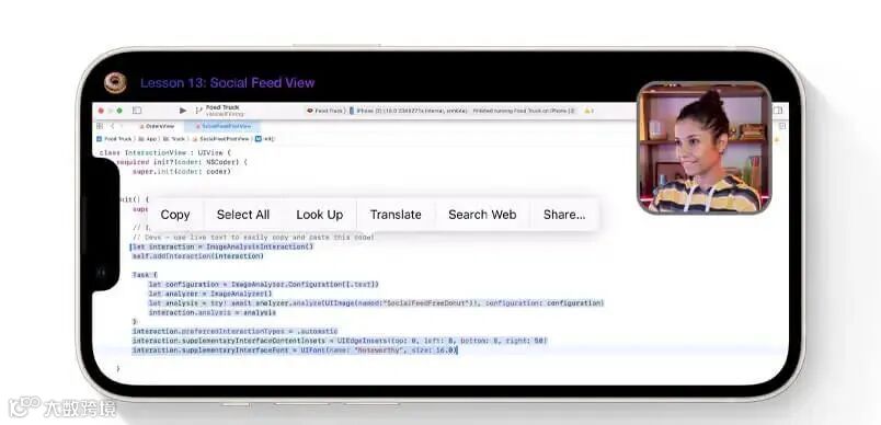 这个功能不得不夸一下了,确实实用。实况文本功能新增了对视频中文本的识别支持。用户可将视频暂停在任何一帧画面上,与其中的文本进行交互操作。暂停播放视频,你就可以复制、拷贝、翻译视频中的任意文字。此外实况文本还增添了供用户快速完成换算汇率、翻译文字等功能。