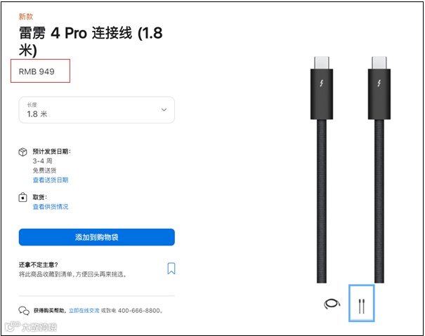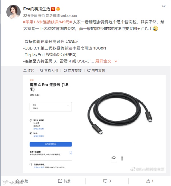 苹果发布会之后,官网也是上架了一堆配件新品,其中雷雳4 Pro连接线的售价引起了网友们的注意,1.8m售价949元,3m版本售价1169元。一根数据线要买1k多,不少网友都表示离大谱。
