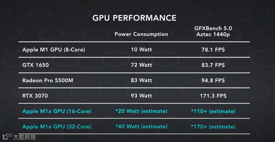 相比之前的 M1,M1X 将提升处理器核心数到 10 核(包含8个性能核心和2个能效核心),其中 14 英寸版本集成 16核 GPU,而 16 英寸版本将集成 32 核 GPU,据传图形表现可媲美RTX 3070。
