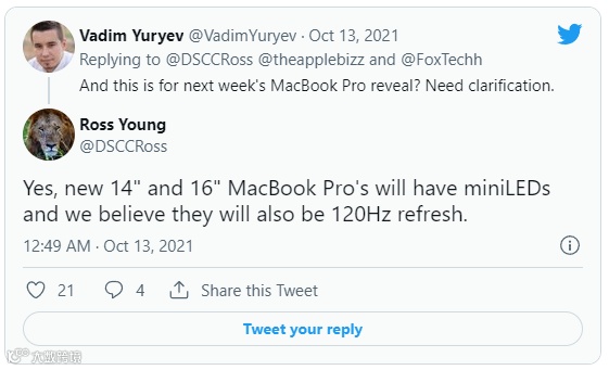同时分析师 Ross Young 也在推特上表示了 14 英寸和 16 英寸 MacBook Pro 机型将配备刷新率为 120Hz 的 mini-LED 显示屏。