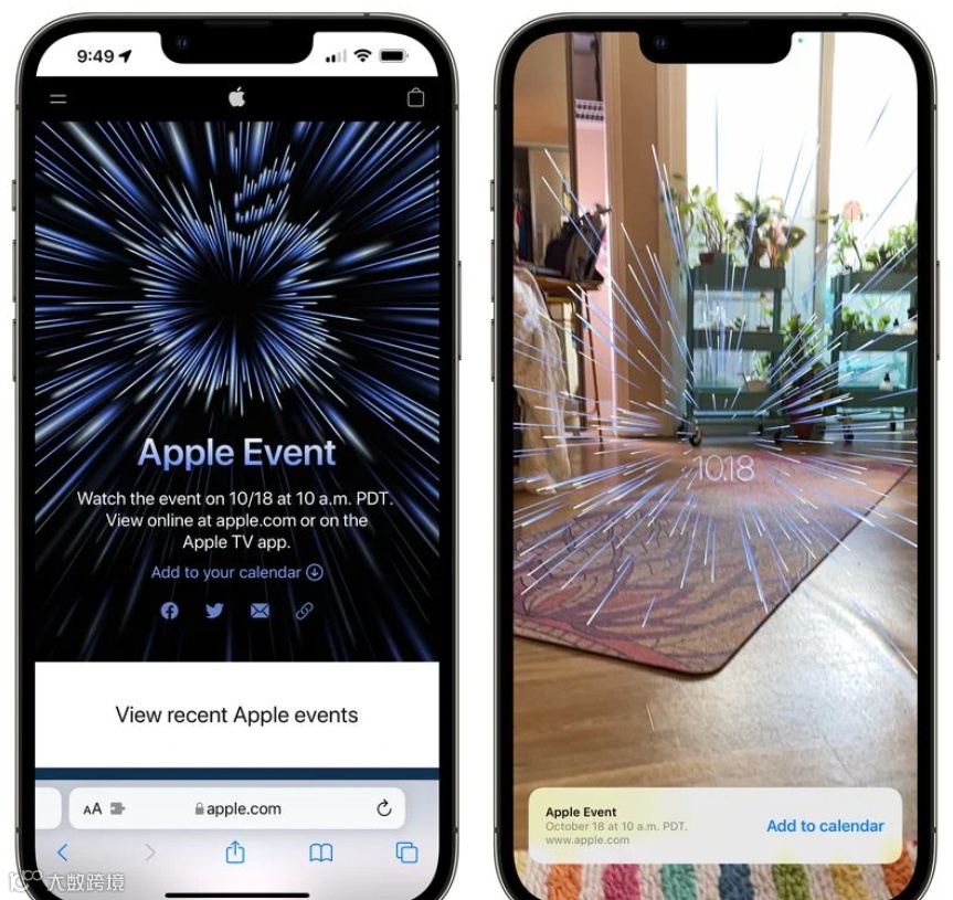这次发布会的slogan是“来炸场”。邀请函跟上次的发布会一样。可以点击Safari 浏览器进入苹果官网,再点击邀请函图片可查看 AR 邀请函。扩散的强光束中间写有发布会的日期。也许“来炸场”是在暗示着更强性能、更强处理器的新品。
