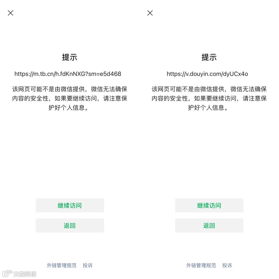 目前升级8.0.13版本的用户都可以打开外部链接了,小希也尝试了一下,确实是可以的,进入天猫或是抖音的链接会自动跳出选择界面,让用户自主选择是否访问。