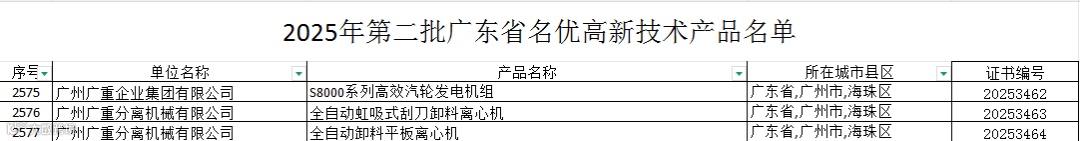 近期,广东省高新技术企业协会公布2025年广东省名优高新技术产品名单,广重集团S8000系列高效汽轮发电机组,以及下属广重分离机公司旗下全自动虹吸式刮刀卸料离心机、全自动卸料平板离心机成功入选。