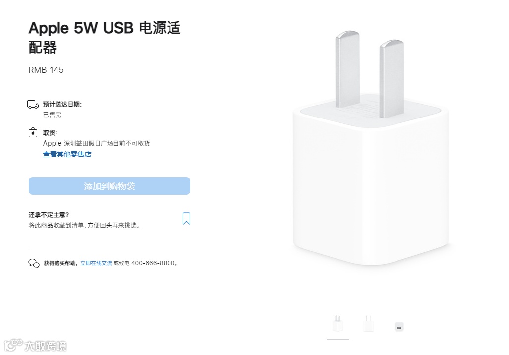 据苹果官网显示,5W USB 电源适配器显示为「已售完」,并且大概率是不会补货了。目前只有个别线下店铺有货。