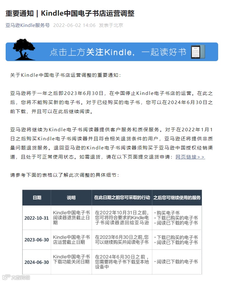 但在6月2日,亚马逊Kindle服务号却突然发布重要通知: