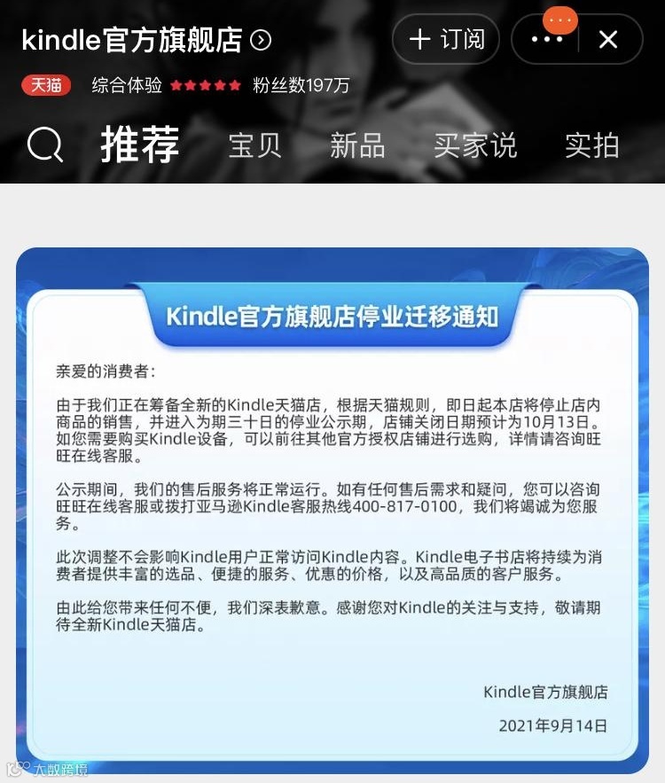 而且在去年九月份的时候,就已经有网友发现了天猫Kindle旗舰店进入了停业公示期。