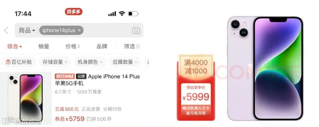 糟糕的市场表现,让iPhone14 Plus的价格一跌再跌。目前在电商平台上,京东开启直降1000的活动,128G版本5999元起;在拼多多的百亿补贴中128G版本的价格则更低,仅需5759元。