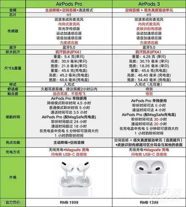 看到这定价是不是有点犹豫,很多铁子会在AirPods Pro跟AirPods 3 之间纠结,那要怎么买呢,我们再来看看这两款的参数对比