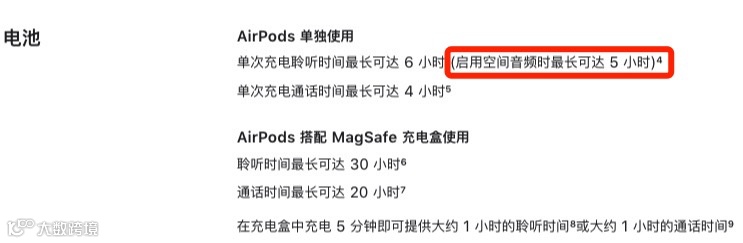 但是官网宣传页中的标注显示,当 AirPods 3 开启空间音频后,单次充电续航会降到 5 小时,那就是和 AirPods 2 一样的续航时间了。