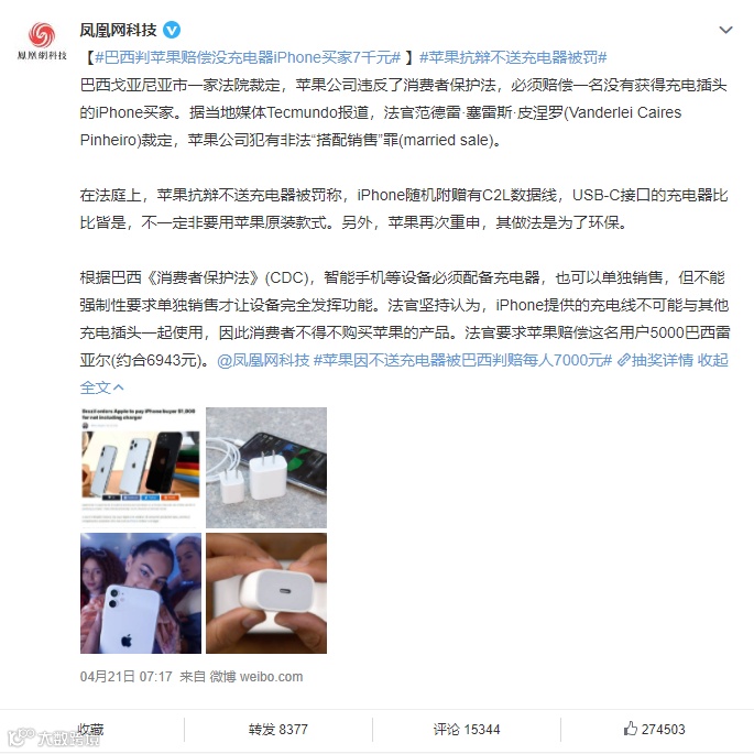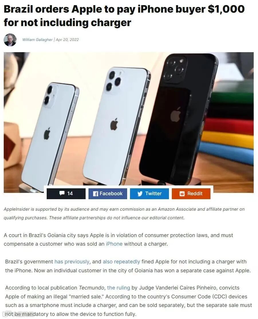 因此,苹果公司在向戈亚尼亚市的一名消费者分别出售iPhone机型和充电器后被判败诉。苹果公司必须赔偿一名没有获得充电插头的iPhone买家5000巴西雷亚尔(约合6943元)。