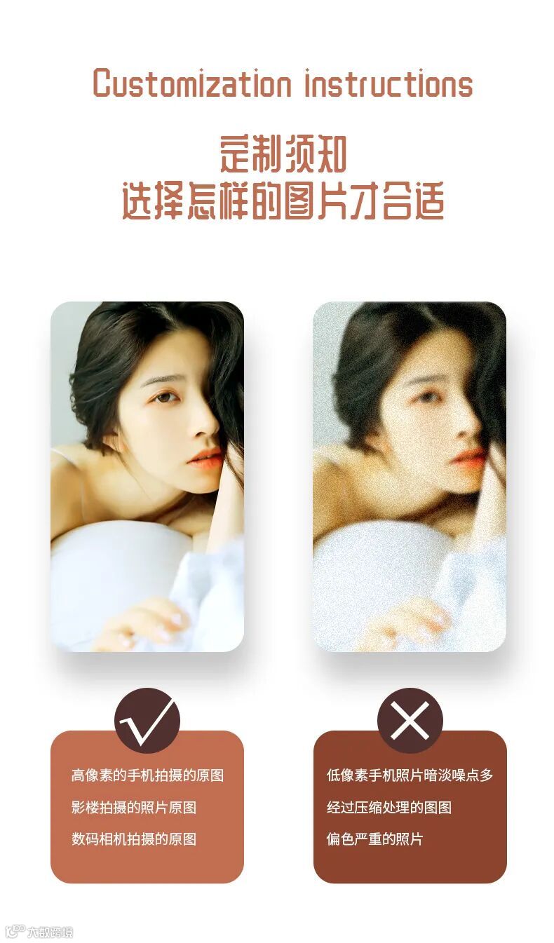 告诉客服你要的手机壳材质(TPU透明壳或液态硅胶壳)、以及壳的底色、还有具体的手机型号 -- 然后发送你喜欢的图片给客服,让客服给你定制效果图 -- 确认效果图后在提交付款订单即可~