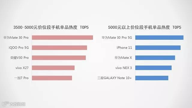 5000元以上价位段关注度最高的依旧是华为制造,从上半年的华为P30 Pro到现在的华为Mate30 Pro 5G,华为早已在高端市场站稳脚跟。除此之外令人惊喜的是vivo NEX3和华为Mate X的上榜。