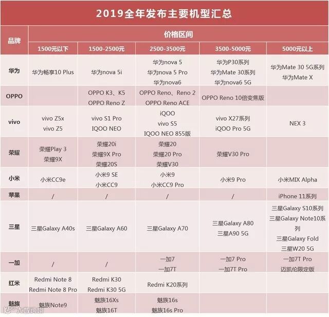 针对消费者最关注的这10大品牌,我们汇总了2019年发布的主要机型。从各品牌新品发布数量以及价位段分布可以看出其对自身品牌的定位以及对市场变化趋势的认识。