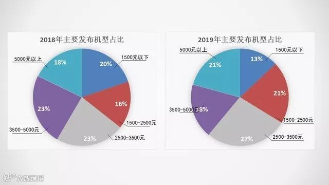 在对这些主要机型按照价位段进行整理并与2018年情况对比后我们发现,2019年1500-2500元价位段与2500-3500元价位段发布的手机数量较2018年共提升了9%,究其原因主要2019上半年4G时代创新力疲软,各品牌都在努力打价格战,尽可能达到同价位无竞品的效果,加之线上销售渠道的打造为低价持续绿灯,在一定程度上刺激销量。