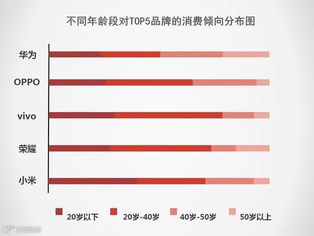 OPPO、vivo、荣耀用户重点发展潮流、时尚的标签,吸引年轻化群体,可以看到其消费者主要集中在20岁以下以及20岁到40岁之间;而小米凭借其多年的低价战略,在20岁以下学生党中优势地位突出。