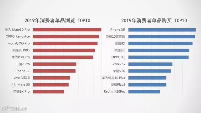 可以看到消费者浏览TOP10与购买TOP10的差异还是很大的,常浏览的产品基本集中在各品牌的高端产品上,而实际消费起来十分实际,加上受到换机周期影响,大多人选择购入中低端机型或旗舰机型中价位相对较低的产品。两榜单重叠产品仅有华为Mate30 Pro、OPPO Reno Ace、荣耀20 PRO和Redmi K20 Pro四款手机。