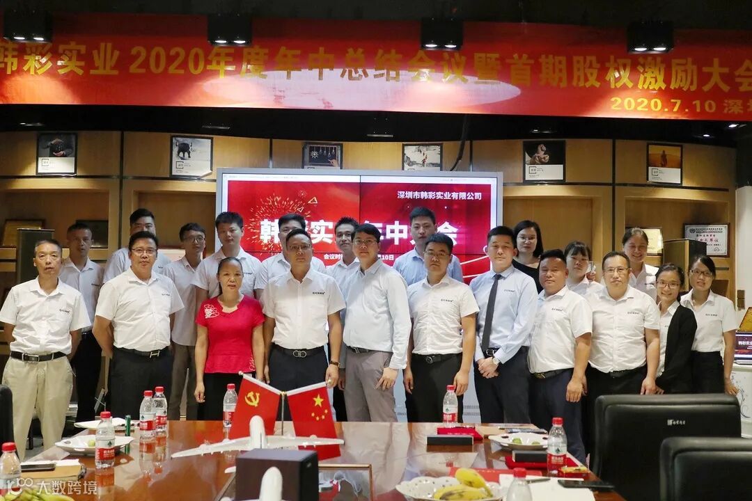 2020年7月10日,深圳市韩彩实业有限公司召开2020年度年中总结会议暨首期股权激励大会,我司董事长、总部及各分(子)公司的核心高管齐聚一堂。会议围绕公司年度发展目标、总结分析上半年工作完成情况、员工股权激励三个部分开展。