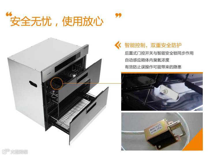 (6)把食具洗净后请将表面的水倒净后才能放进柜内一次竖放在搁架上,最后关好柜门,注意不要把餐具放得过密,以免影响消毒效果。