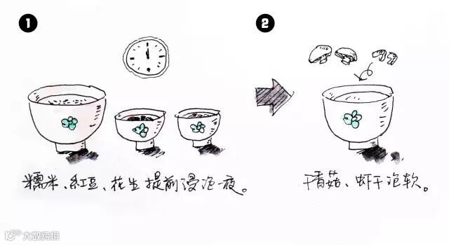 糯米250克、腊肉100克、香肠100克、红豆50克、干香菇5朵、干虾仁50克、银杏30克、花生50克、酱油15毫升、糖5克、香油5毫升、油15毫升