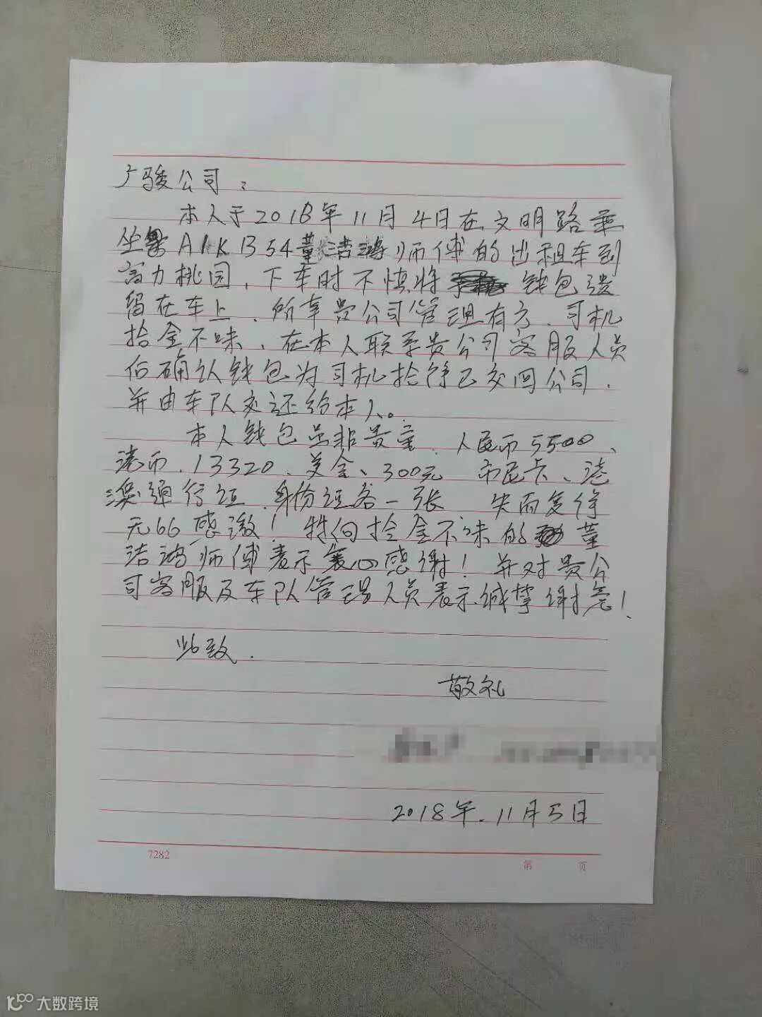 11月4日,晚上23时左右,港商梁先生结束了一天的会展,由于过于疲惫,不慎在下车时将一个钱包遗失出租车上,内有人民币港币、美金合计2万多元以及身份证、港澳通行证等重要证件,所幸的是,董洁鸿司机及时送还失物,让梁先生免遭重大损失。