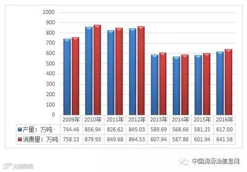 智研咨询发布的《2017-2023年中国润滑油市场供需态势及未来发展前景评估报告》中指出:2016年国内润滑油产量同比增长6.14%,达到617万吨。同期海关数据显示:2016年我国润滑油进口量为34.55万吨,出口量为9.97万吨,国内表观消费量为641.58万吨。