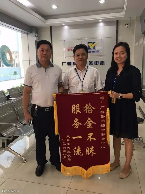 2016年8月22日下午,王先生怀着喜悦的心情来到广骏集团,从工作人员手中拿回了不慎遗留在出租车上的三星手机。王先生的手机失而复得,心情万分激动,连连向司机和工作人员竖起大拇指,并将绣有“拾金不昧,服务一流”的锦旗交到了工作人员手中,赞扬他们拾金不昧、急客所急的高尚品德和职业操守。