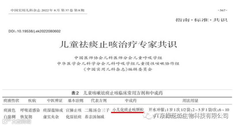 《儿童祛痰止咳治疗专家共识》(2022)推荐小儿化痰止咳颗粒