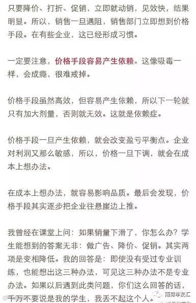 卖产品思维的人,喜欢动用价格手段,比如降价、打折、促销等,这类手段都是降价或变相降价,因为他们最简单有效。但负作用也最明显。