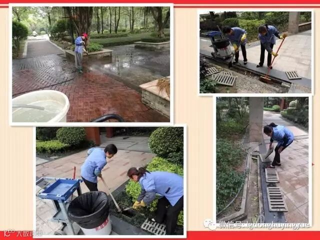 排水系统维护:清理路面排水沟和地库积水井淤泥,保持排水畅通,减少渗水、水浸现象,及时维护因台风吹到的绿化。