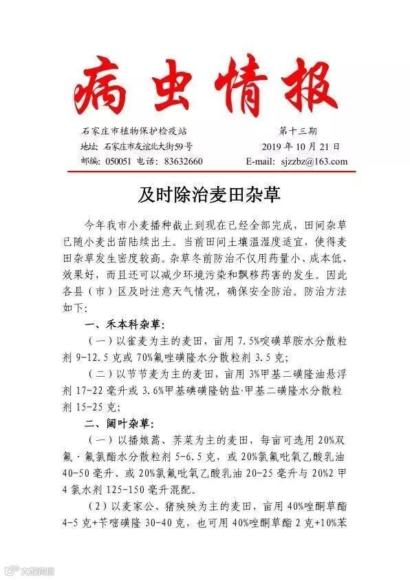 随着田间杂草已随小麦出苗陆续出土。当前田间土壤温湿度适宜,使得麦田杂草发生密度较高。不仅杂草冬前防治用药量小、成本低、效果好,而且还可以减少环境污染和飘移药害的发生。有关植物保护检疫站针对杂草发布了相关情报。