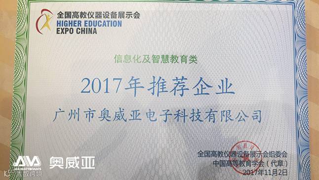 在不久前举办的第50届全国高教仪器设备展示会上,奥威亚将又一行业大奖收入囊中!奥威亚荣获由组委会、中国高等教育学会联合颁发的信息化及智慧教育类“2017年推荐企业”。此次评选活动,在参展的649家企业中仅有50家获评入选,奥威亚有幸位列其中,且是国内唯一一家入选的录播企业。
