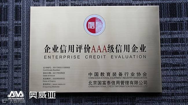 企业信用评价,是指信用评级机构在严密分析的基础上,根据行政法规、企业经营情况、财务能力等因素进行综合考核,对企业信用程度进行划等级。信用等级普遍采用国际通行的"四等十级制",具体分为:AAA,AA,A,BBB,BB,B,CCC,CC,C,D。奥威亚经过层层考核、评估,最终以良好的经营状况和信誉度,荣获教育装备行业AAA级的企业信用证书。