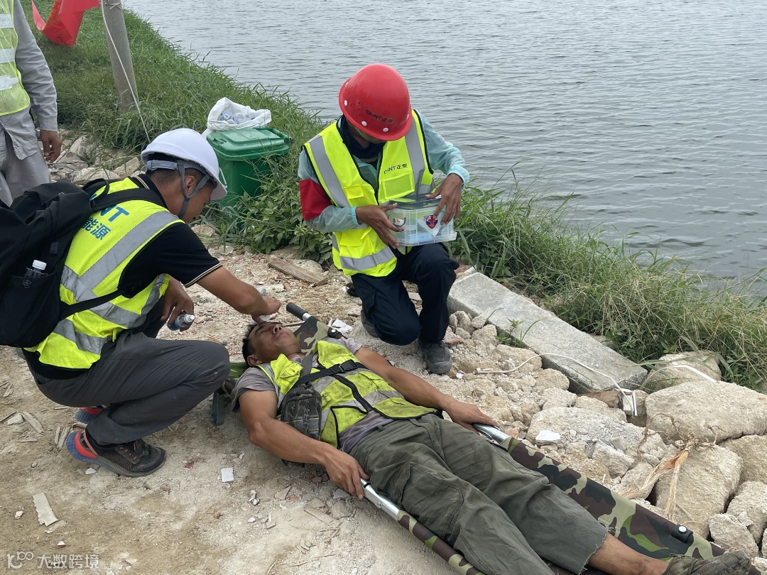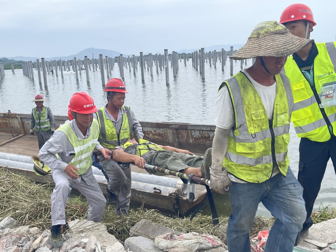 本次预演的场景为35℃高温环境,打桩船上一施工人员突发头晕、恶心等身体不适情况,有中暑迹象。现场施工负责人叶海鹏接到报告后下令,立即启动《防中暑专项应急预案》,开展救援行动,用担架将中暑人员从打桩船转移到通风阴凉处。