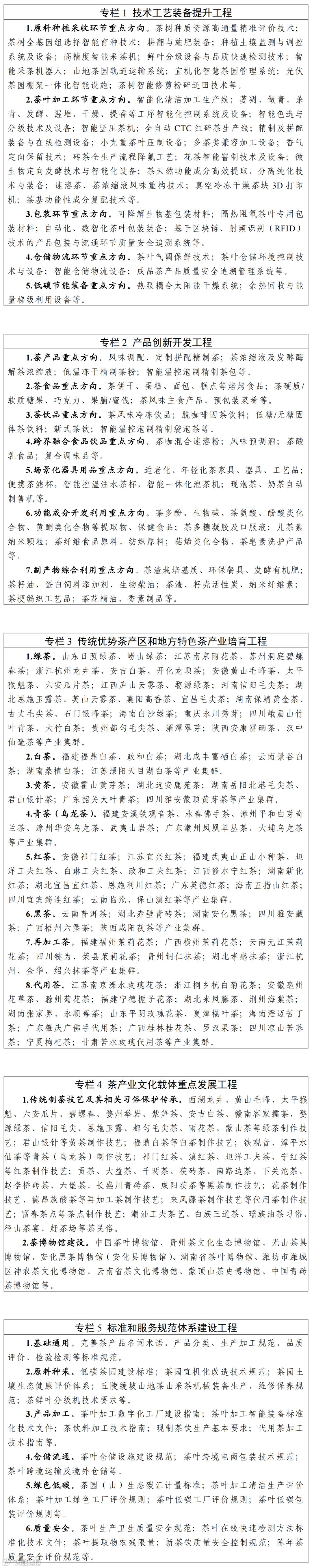 《茶产业提质升级指导意见(2026—2030年)》围绕提升产业科技创新水平、培育壮大经营主体、推进特色产业集群建设、推动全产业链提质升级、构建茶文化价值体系、完善配套支撑体系6方面提出19项重点任务,聚焦技术工艺装备提升、产品创新开发、传统优势茶产区和地方特色茶产业培育、茶产业文化载体重点发展、标准和服务规范体系建设5方面设置了专栏。《酿酒产业提质升级指导意见(2026—2030年)》围绕增强原料供给保障能力、提升产业科技创新水平、调整优化产业结构、转变产业发展方式、发展新模式新业态、加强品牌文化赋能、完善产业支撑体系7方面提出21项重点任务,聚焦酿酒原料标准化基地发展、技术工艺装备提升、地方特色酒产区培育、标准规范体系建设4方面设置了专栏。
