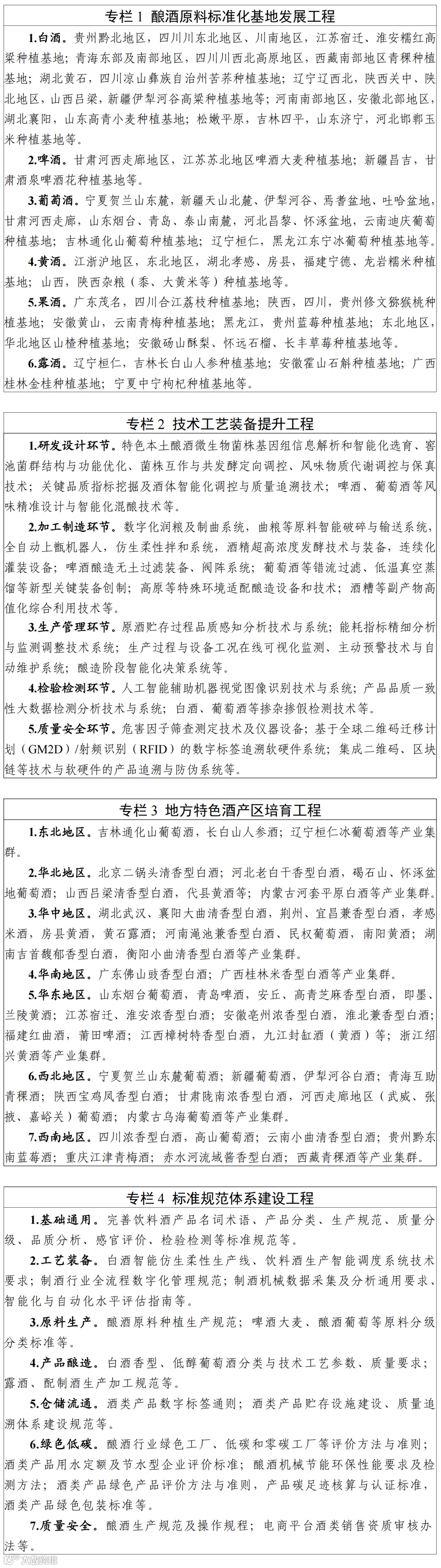 9.促进跨区域产业分工协作。鼓励地方充分发挥产区辐射作用,带动酿酒机械、包材容器等关联产业发展。支持酿酒产业链跨地域配套协作,开展酿酒专用粮基地、技术创新平台、信息基础设施等共建共享,提升资源利用效率。引导产能向生态承载能力强、原料资源富集地区和园区有序转移,促进技术、人才、资本等要素向中西部流动。