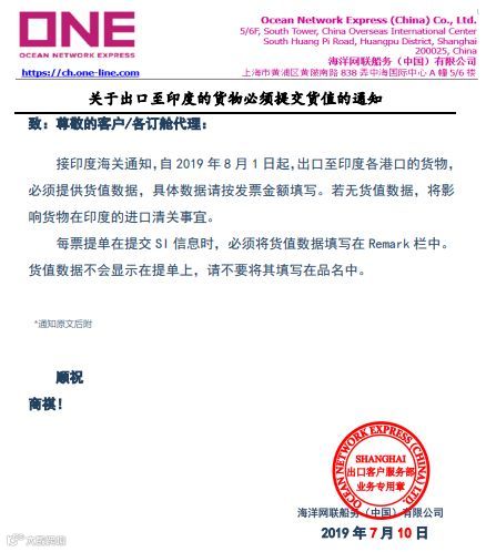 印度海关新通知,自2019年8月1日起,出口至印度各港口的货物, 必须提供货值数据,具体数据请按发票金额填写。若无货值数据,将影响货物在印度的进口清关事宜。