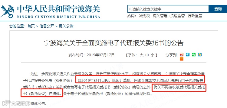 7月17日,宁波海关发布公告,决定全面实施电子代理报关委托书(委托协议),自2019年8月1日起,海关不再接收纸质代理报关委托书(委托协议)扫描件。